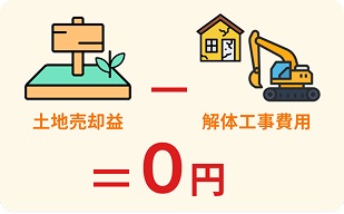 空き家解体にかかる費用や土地売却にかかる諸経費など全て弊社にて負担させていただきます。土地・建物を売却しても売値にあまり期待が持てないまたは買い手がつかない物件の場合はお得で賢い方法です。簡単に説明すると弊社不動産部門がお客様の土地を買い取らせていただき、解体費用と相殺します。そうすることによりお客様には費用負担が及ばないようにしております。